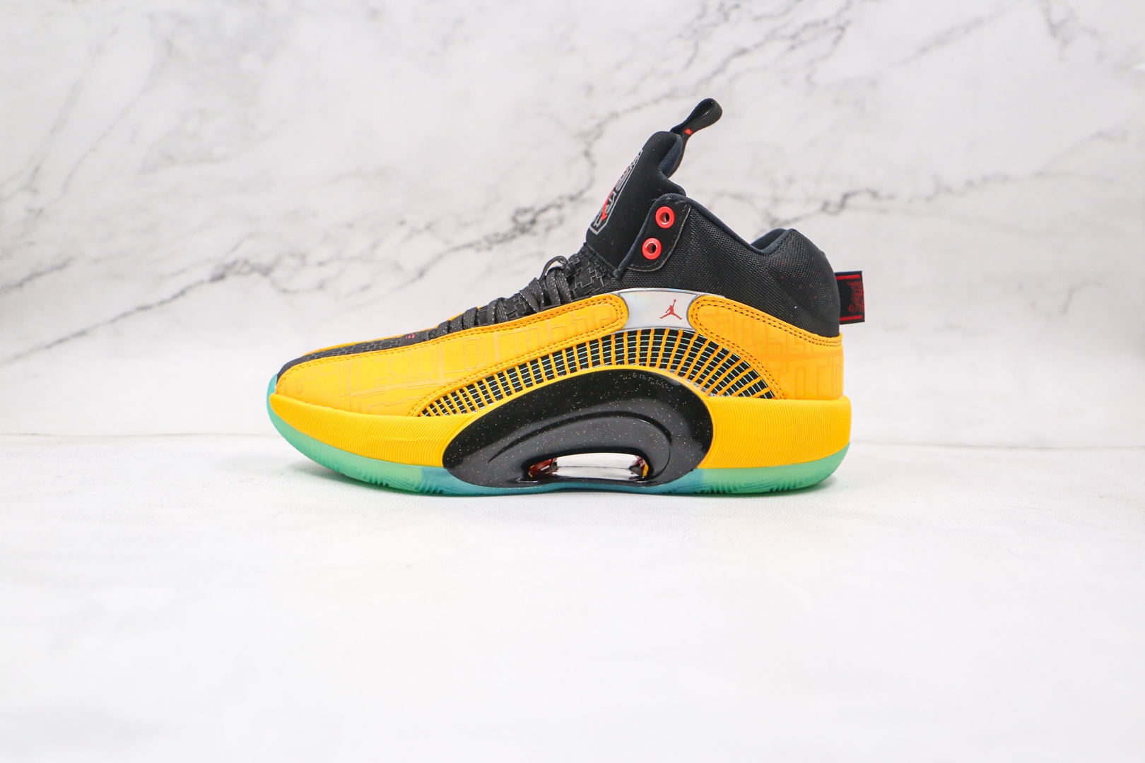 乔丹AJ35黑黄Air Jordan 35 FC PF“Dynasties”紫禁镂空缓震实战篮球鞋超大面积前后真实ZOOM加持,这款鞋采用隐身的防撕裂基础结构和衣领覆盖层进行了类似的设计出现了新的颜色在鞋子上鞋跟品牌鞋带和鞋绳等区域都用了黑色来进行点缀。
