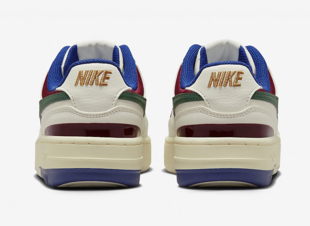 这款鞋采用了水手、绿色、栗色、蓝色和金色的混合色调。这款耐克Gamma Force鞋采用皮革结构,领口和内衬采用网眼,在中底板附近有少量的麂皮。脚下的现代鞋底单元完成了设计。
