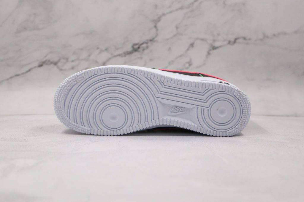 耐克空军一号黑绿粉色字母弹幕花纹刺绣钩子低帮Nike Air Force 1’07 Low “World Wide” 这双鞋以黑色鞋面基底,搭配绿花纹勾勒鞋身鞋带和鞋舌均以弹幕花纹点缀侧边浅青色匝线勾勒Swoosh Logo鞋舌还带有青色拉环整体设计辨识度超高。